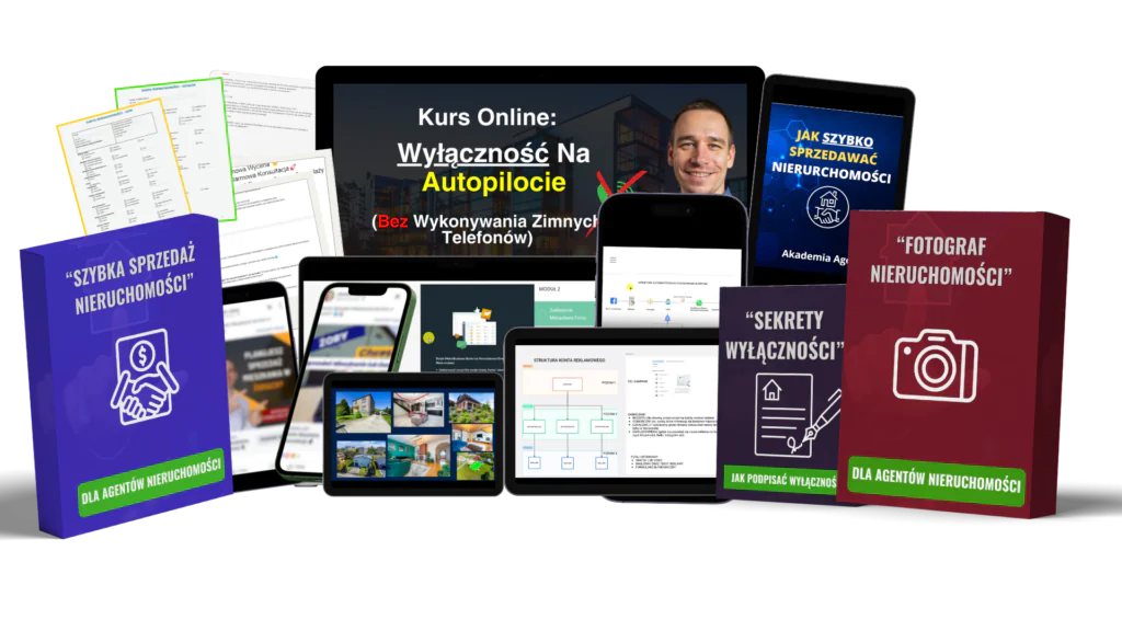 Dodatkowo otrzymasz również wszystkie bonusy oraz komplet kursów wspierających (Sekrety Wyłączności, Szybka Sprzedaż Nieruchomości, Fotograf Nieruchomości) + skrypty rozmów i wideo reklamy.